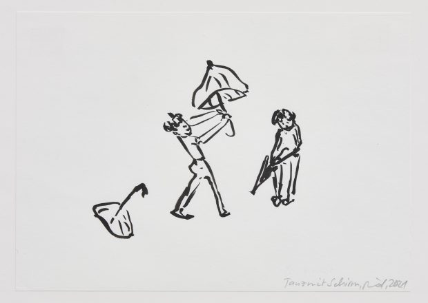 - Barbara Petzold, Tanz mit Schirm, 2021, Tusche auf Papier, 15 x 21 ,5 cm